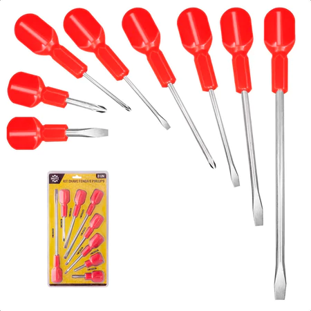 Complete sua caixa de ferramentas com este Jogo de Chaves de Fenda e Phillips de alta resistência. Composto por 8 peças essenciais, o kit é fabricado em aço de qualidade, garantindo maior durabilidade e precisão no aperto e desaperto de parafusos.